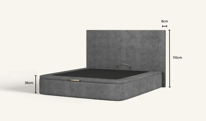 O Sommier Emma tem 36cm de altura e a caixa de arrumação 30cm de altura. A estrutura interior em tubo de ferro é dividida em 2. Sistema de abertura fácil frontal através de elevação com amortecedores.